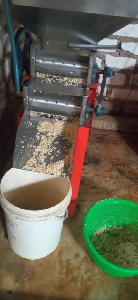 Mesin dilengkapi dengan bahan stainless steel food grade sehingga lebih aman untuk bahan makanan. Selain itu mesin memiliki dimensi dengan panjang 60 lebar 60 dan tinggi 120 cm. Mesin digerakkan dengan motor listrik dengan kekuatan 0,5 Hp yang memiliki kapasitasn 150 kg/jam. Mesin ini dapat dioperasikan dengan mudah (easy to use) oleh para produsen, karena telah sudah didesain untuk dapat mengolah proses pengupasan,pemisahan dan pemecahan kulit ari kedelai secara bersamaan. Dengan adannya inovasi ini diharapkan dapat meningkatkan produktivitas dan efektivitas hingga 3 kali lipat. Sehingga dapat bermanfaat bagi peningkatan ekonomi UKM”, Ujar Rachmad.